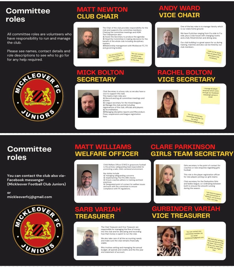 You can contact any of our committee via our email address – mickleoverfcj@gmail.com