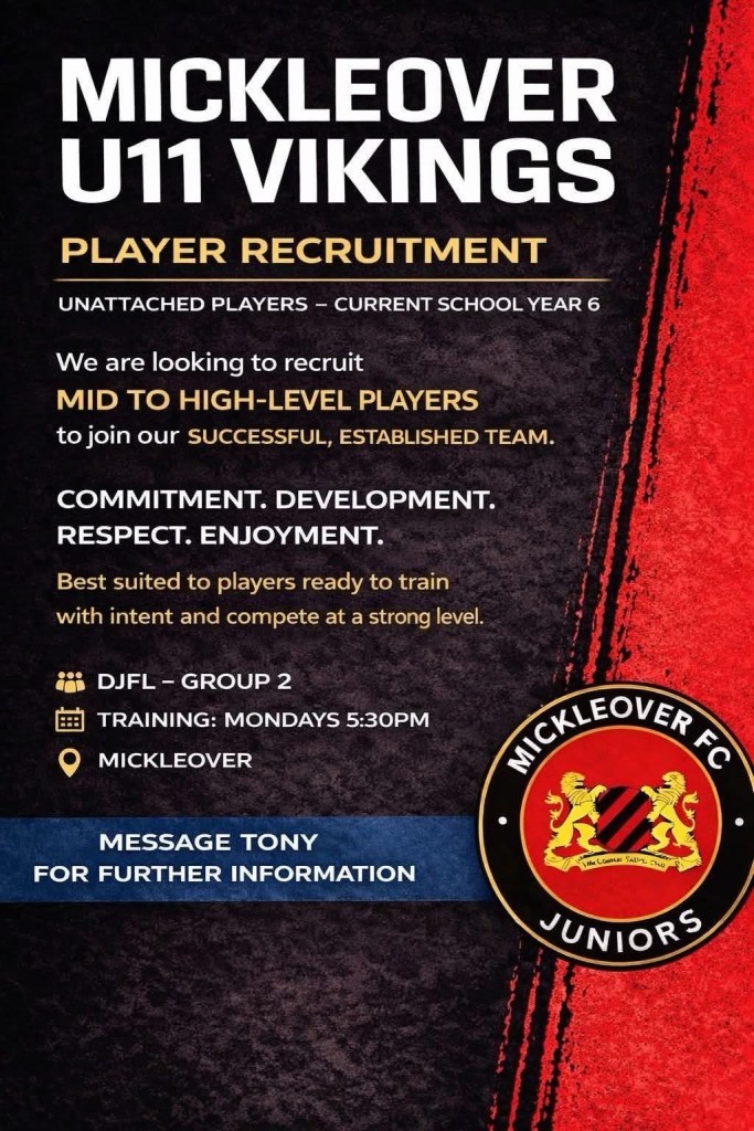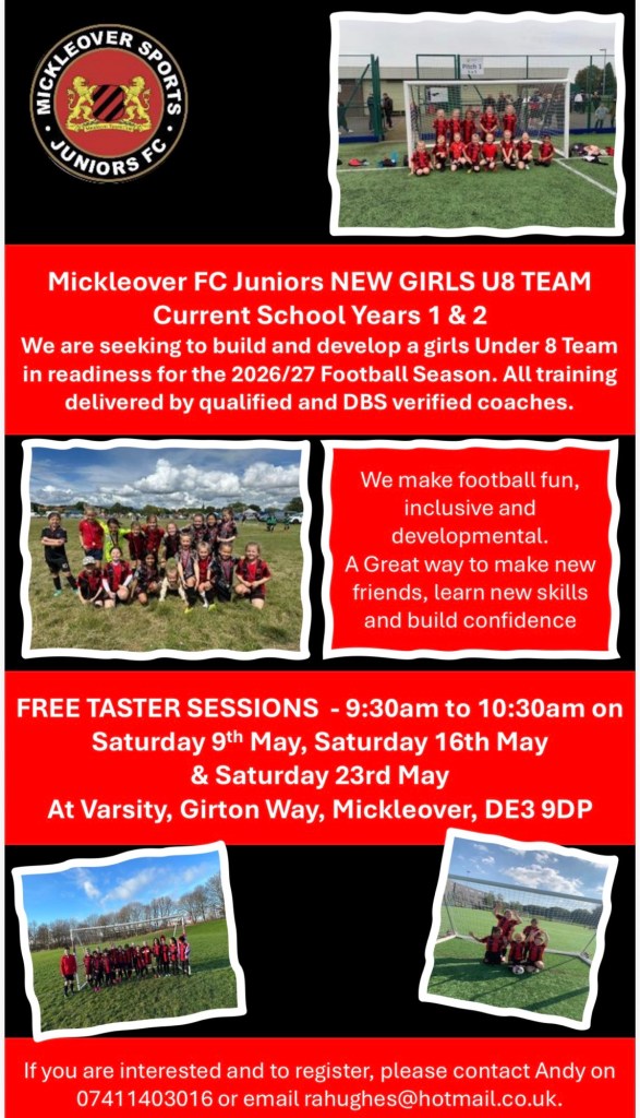 If no playing opportunities exist for the correct age group, please keep an eye on this page and Mickleover FC Juniors Facebook page. All spaces will be advertised as they arise